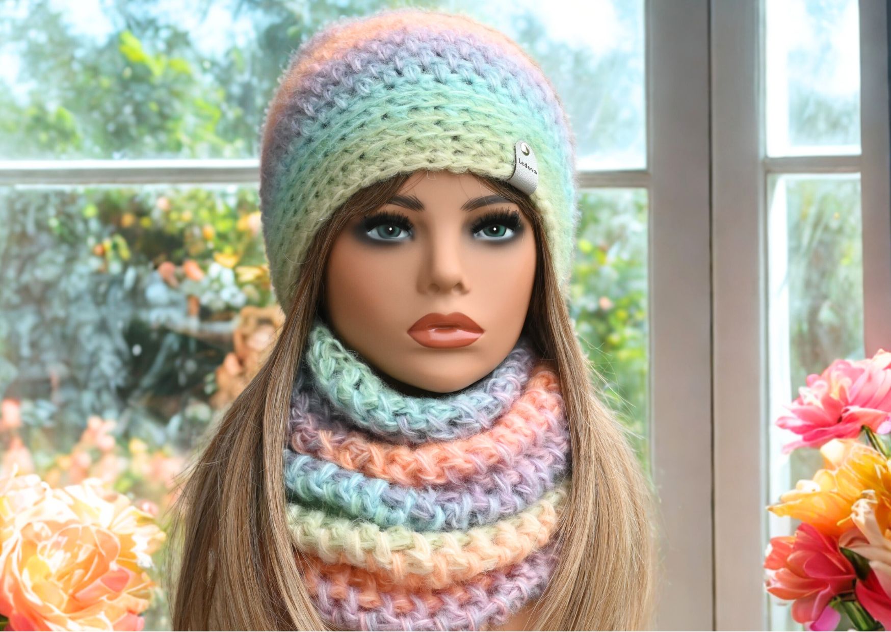 Háčkovaná souprava čepice s nákrčníkem z lehoučké nadýchané chlupatkové příze .