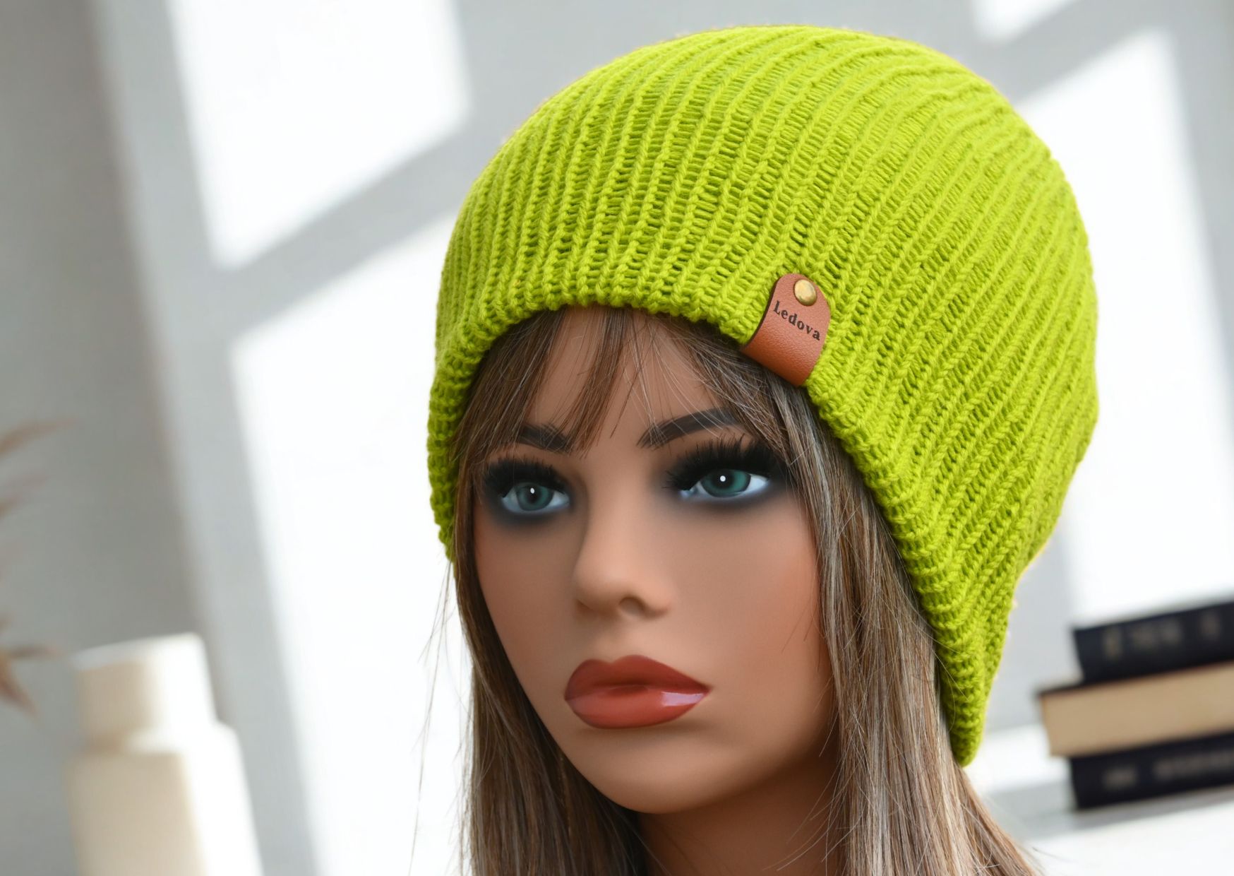 PLETENÁ BEZEŠVÁ KAŠMÍROVÁ ČEPICE V KRÁSNÉ OLIVOVĚ ZELENÉ BARVĚ