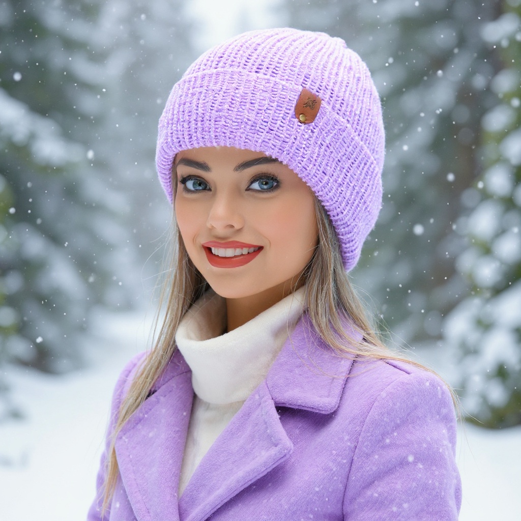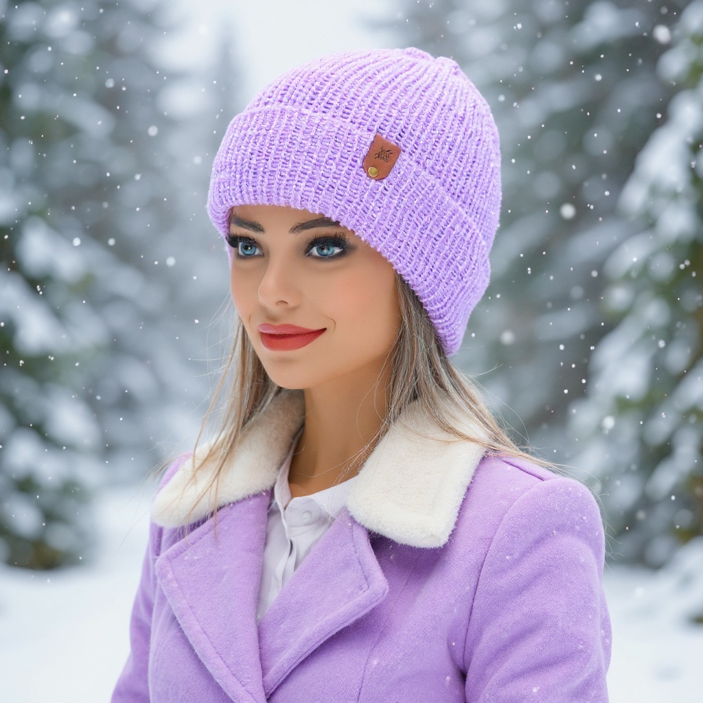 Pletená bezešvá čepice v UNI velikosti z velmi příjemné a jemné akrylové příze v barvě lila