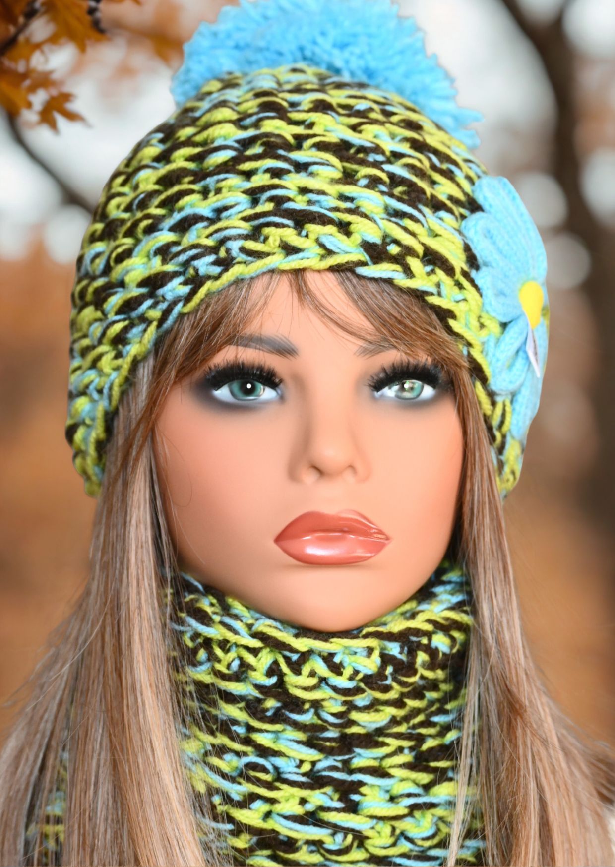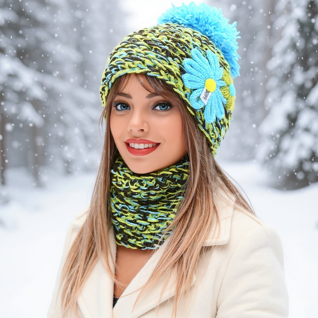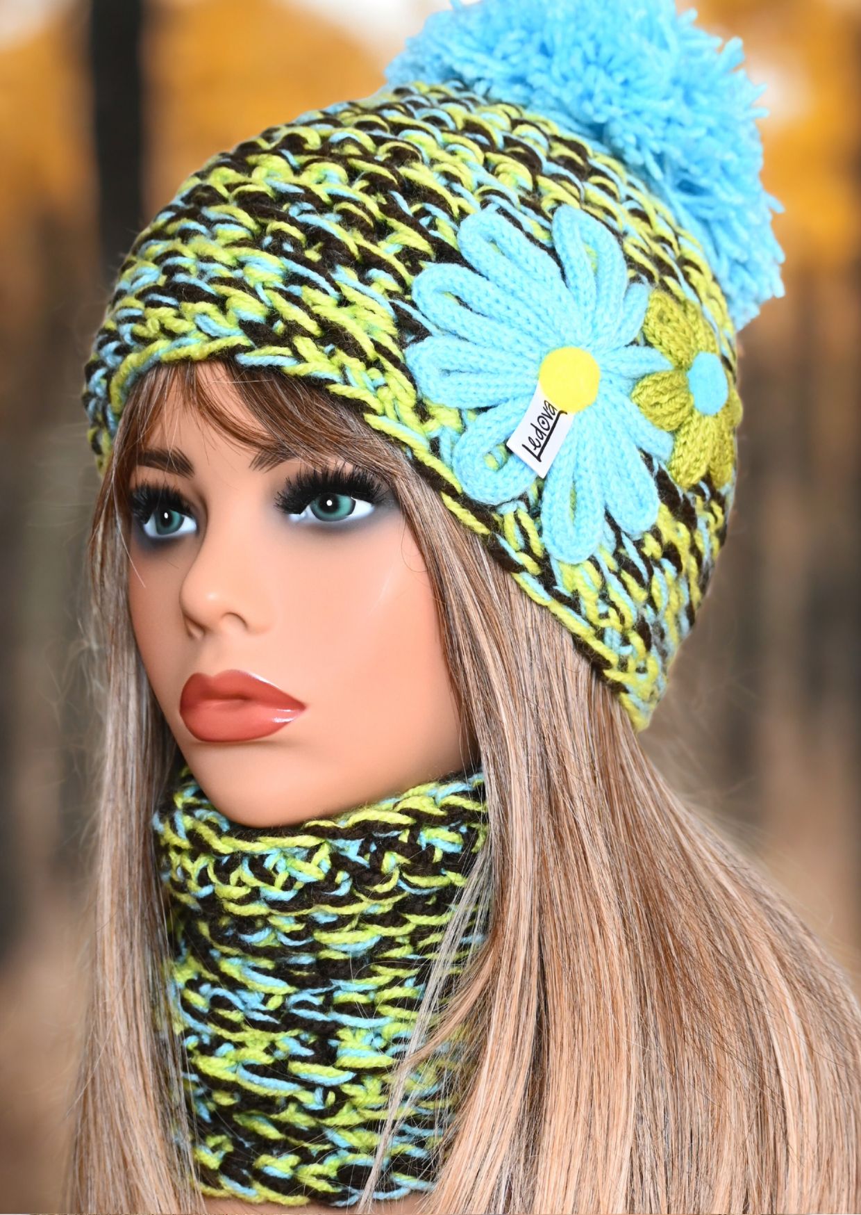 Velmi hřejivá souprava, která vás spolehlivě zahřeje i v nejchladnějších dnech. Kombinace kulíšku s velkou bambulí a tunelu (nákrčníku) z měkké akrylové příze je nejen praktická, ale i mimořádně slušivá díky jemnému zdobení kytičkami.