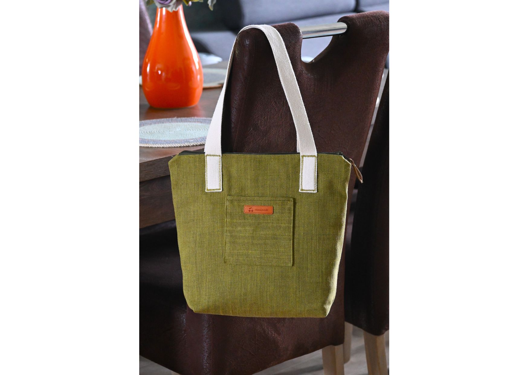 - Přední , zadní strana – Vysokogramážní tkanina ve složení bavlna/len v olivově zelené barvě, zavírání na zip, vnější kapsička na drobnosti